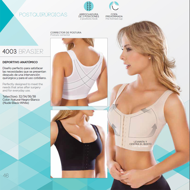 Description: Post Surgical Brassiere with wide straps. Products of high quality and perfect design to satisfy needs presented after an a esthetic surgery. Post Surgery Bra with Band. Cotton Lycra Bra. Suitable for post surgical use, sport and sleep Bra. Stabilizing straps to help prevent bounce. . Pre-molded for perfect adjust. Control back. A multitasking bra for an active, multitalented woman! Its back in X reinforcement made of powernet provides excellent back support and helps maintain good posture throughout the day. Double layered contour cups have good coverage and provide a nice bust shape. Firm control smoothes bra bulges. Wireless, wide under bust band for support while exercising, adjustable straps are comfortable and provide the best support to reduce the weight of your bust on shoulders.